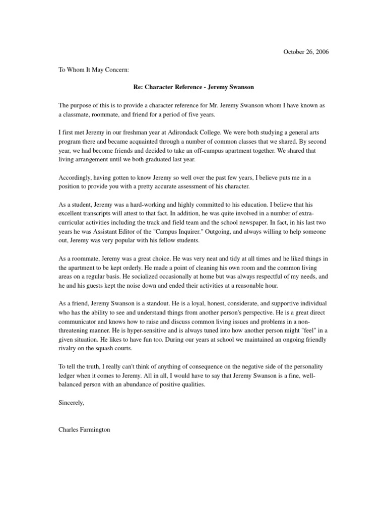 This type of letter is also known as a personal letter for a friend. Either a former employer needs a written note in the best way. How to write a character reference letter for a friend the letters of character for a friend should start with the reader's address followed by the date at the top left corner of the letter. A reference letter for a friend can also be described as a character reference letter. A character reference is more personal than professional and will endorse the candidate's positive attributes, morals and values. Target exactly who should provide a letter on your behalf. Writing an immigration letter of support for a friend an immigration reference letter is different than a reference letter for a job. Personal reference letters are common additions to applications for candidates who are seeking their first jobs. This is a document written by an individual who knows personally. … rather than covering your skills and competencies in the workplace, the personal reference will cover your personality, character, behaviour and ethics. Many employers ask candidates to provide character reference letters so they can get a sense of who the person behind the resume actually is. A sample character reference letters ensures that the concerned person has a sound character and is fit for any professional or. Though a personal letter, the language has to be strictly formal and unnecessary details have to be avoided at all times.